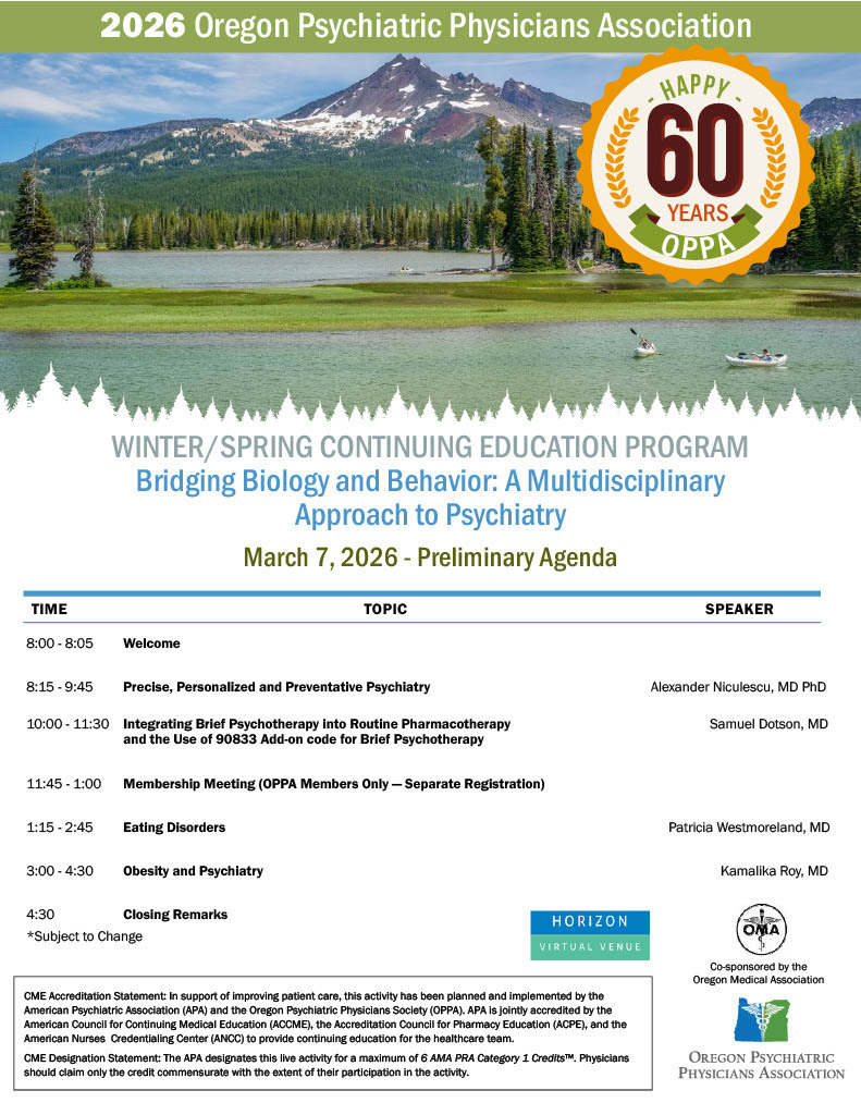 CME Accreditation Statement: In support of improving patient care, this activity has been planned and implemented by the American Psychiatric Association (APA) and the Oregon Psychiatric Physicians Society (OPPA). APA is jointly accredited by the American Council for Continuing Medical Education (ACCME), the Accreditation Council for Pharmacy Education (ACPE), and the American Nurses Credentialing Center (ANCC) to provide continuing education for the healthcare team.
